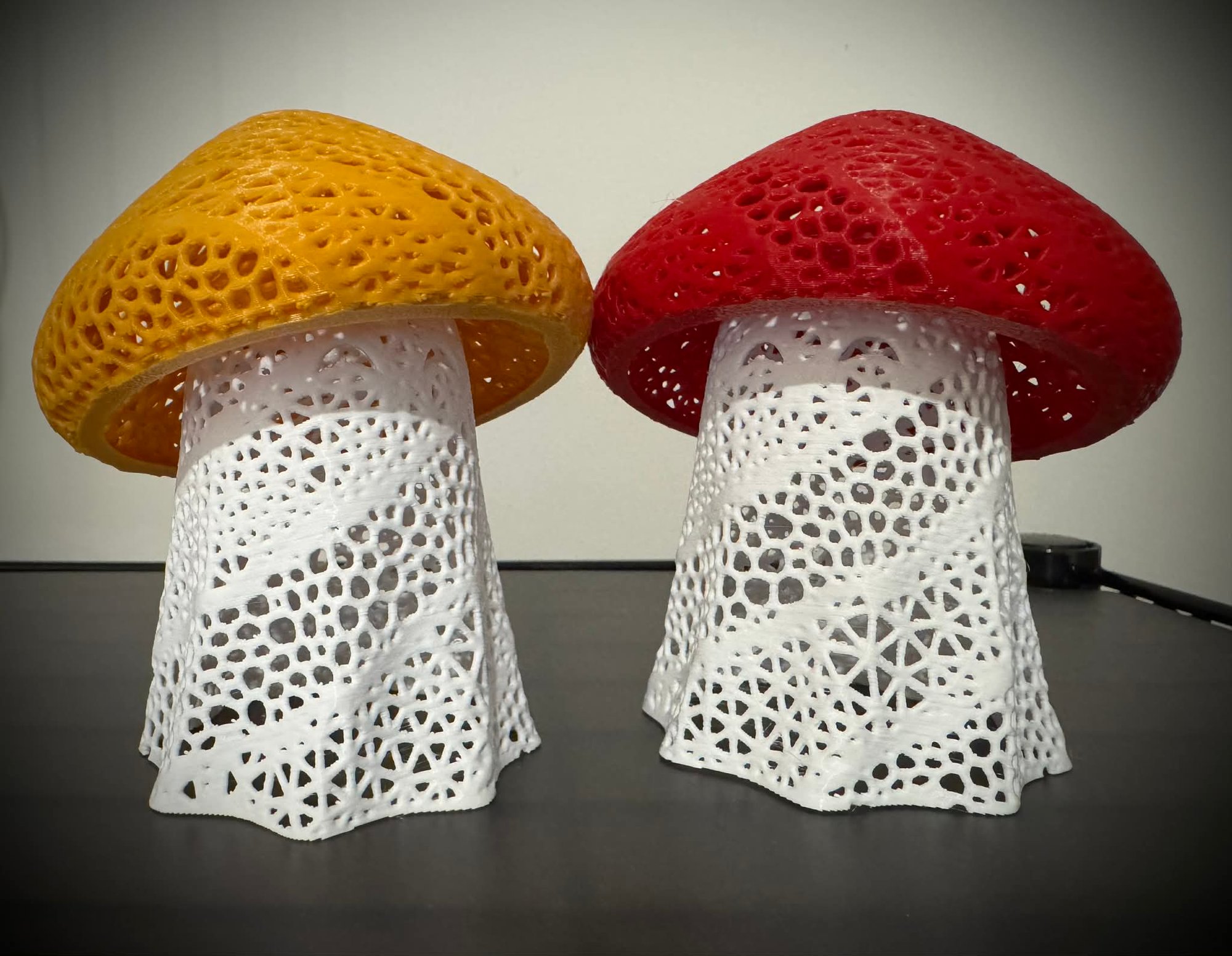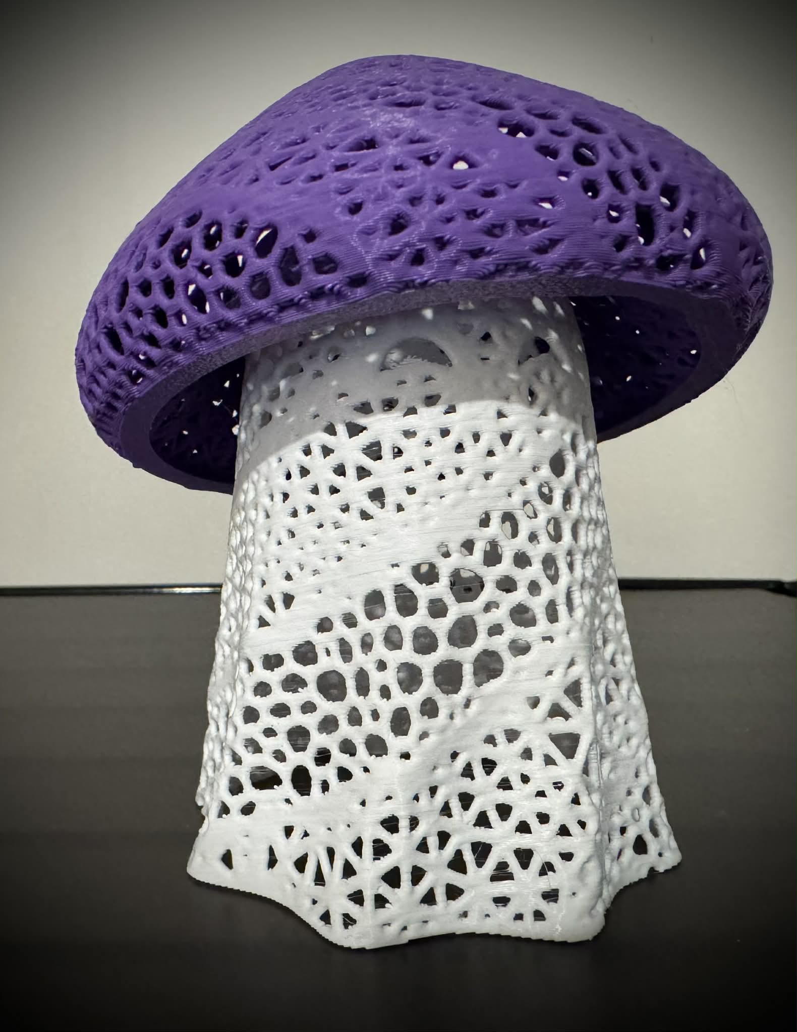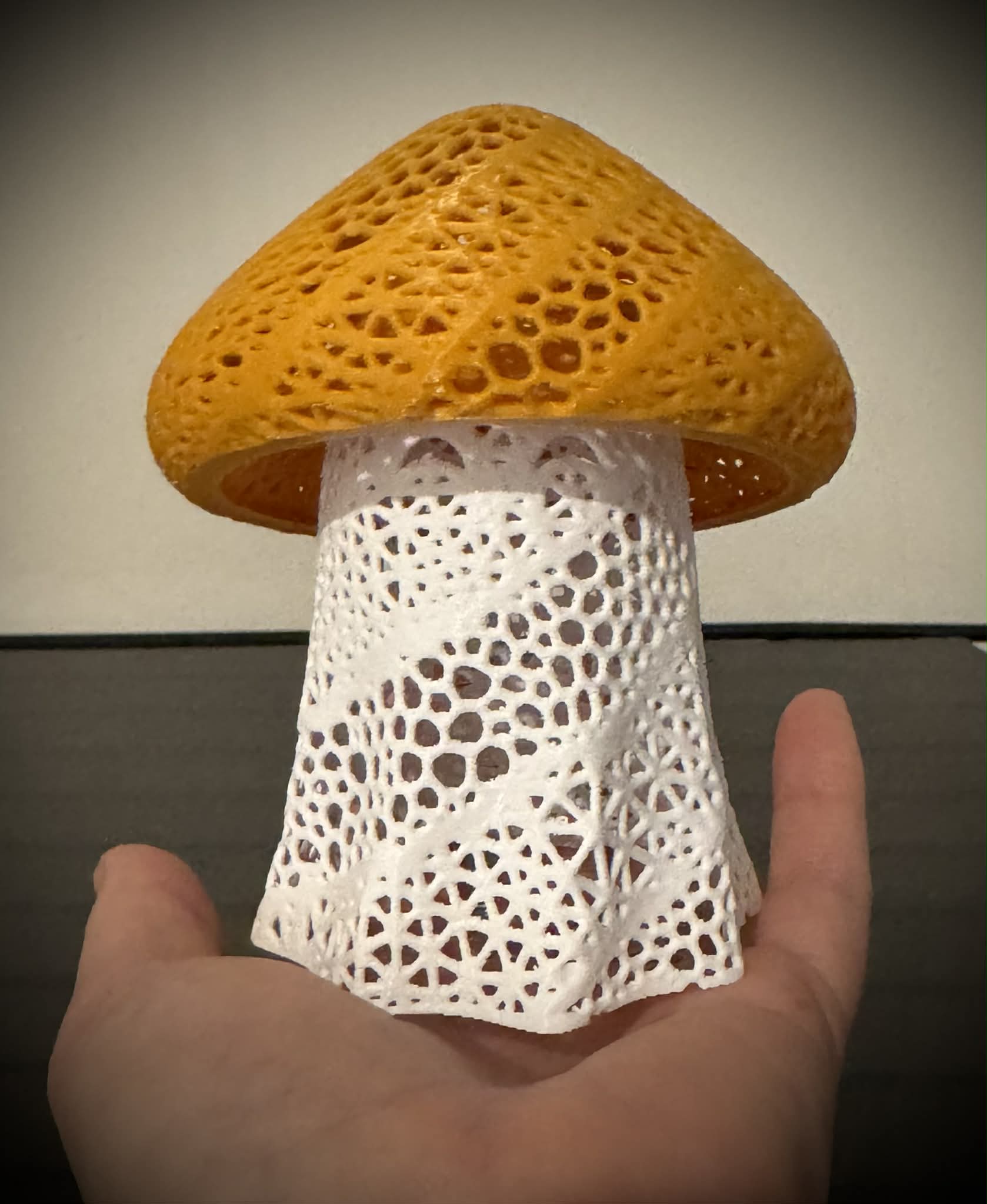 Designed with an intricate, web-like lattice structure, this mushroom captures the delicate beauty of forest fungi while providing a modern, geometric twist. When lit, the "Ghost Mushroom" casts a mesmerizing array of shadows, transforming any room into a cozy, ethereal sanctuary.